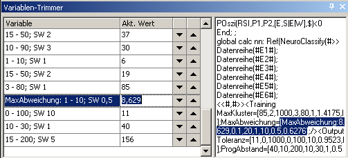 Neuronale Verfahren direkt in die Regeln eines Handelssystems einbinden. Mit zusätzlichen Indikatoren und Variablen-Trimmer.
