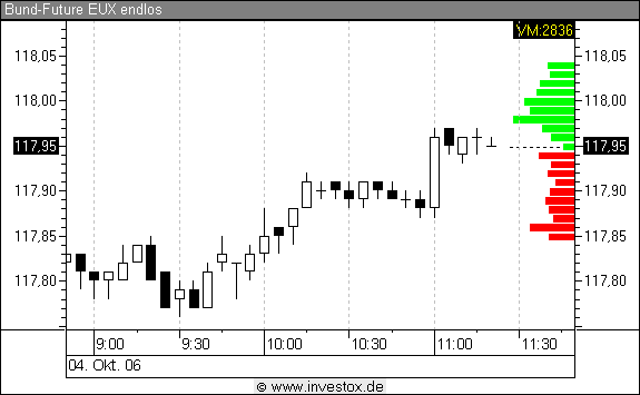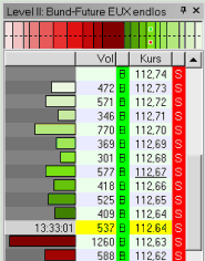 Das folgende Beispiel zeigt die Darstellung der Markttiefe direkt im Chart. Das maximale Volumen ist am oberen Ende der Skala eingeblendet.