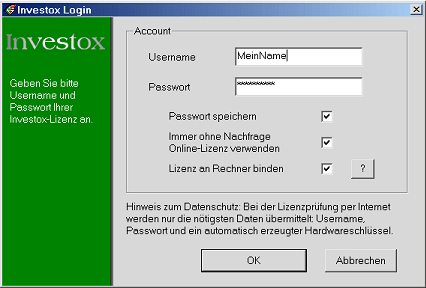 Login: Wenn Sie Investox oder Investox RTT nach der Installation starten erfolgt eine Abfrage Ihrer Lizenz.